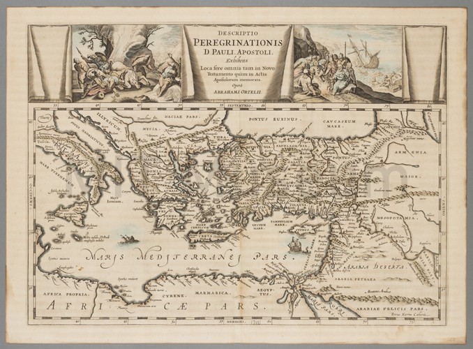 Hand-colored map of the Duchy of Urbino with two descriptive cartouches and a coat of arms. The cartouche on the right has a dedication to the Duke of Urbino, Francesco Maria II della Rovere (1548-1631). The map is oriented so that the Adriatic Sea is on top. Page taken from an Italian edition of "Theatrum Orbis Terrarum" published c. 1608. Italian text on verso with hand-colored decorated initial.