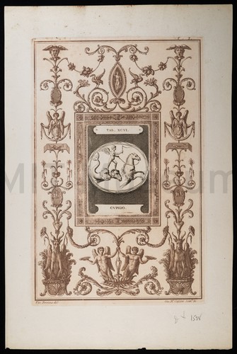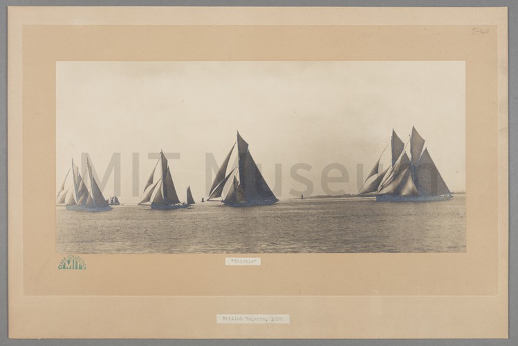 Uncolored engraving depicting two three-masted ships at sea, with sails down. Each bears flags with three horizontal stripes. In the far left are men in a small boat, one holding what may be a harpoon or perhaps a long oar. More ships in left-hand background. Artist signature at top left. Numeral "4" in lower margin, right.