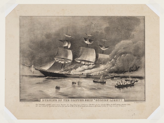 Etching depicting a view of a single-masted flat bottomed boat at sea, with a harbor city visible in the left-hand background. With title, "F", and "10" printed in lower margin. The letter refers to the number of the volume of Groenewegen's works, and the number to its position in that volume.
