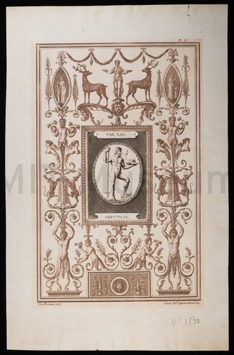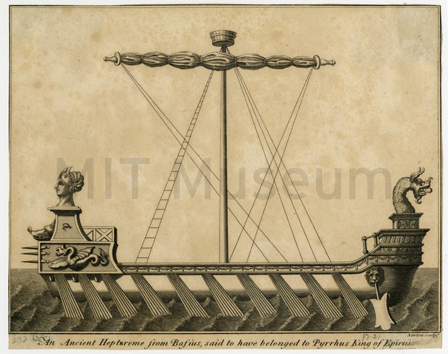 Etching depicting a side view of a two masted ship with a large block of some sort of cargo attached to the side nearest the viewer, and two men on a boat in front of it, at sea. With title and "A", "2" printed in lower margin.