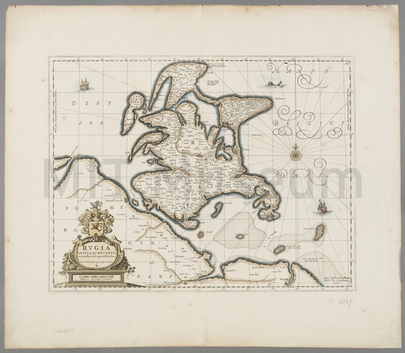 Etching depicting a view of a katschip (Dutch vessel often used in the timber trade) hoisting anchor. She flies the Dutch flag at stern. There is a city with a windmill visible in the background, and a small rowboat in the foreground at right. With title, "E", and "10" printed in lower margin. The letter refers to the number of the volume of Groenewegen's works, and the number to its position in that volume.