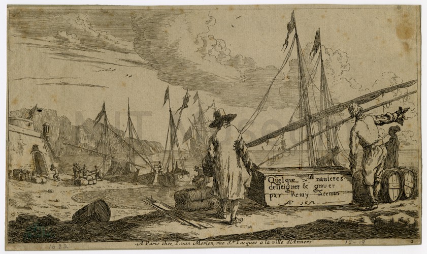 Cover page with etching depicting a view of a fishing boat of the type called "Zyose-bom" in Dutch at sea. On the sail is printed the book title in Dutch and French: