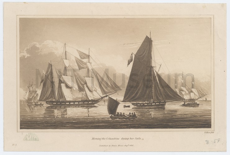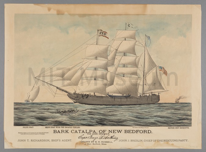 Entrance to Savannah River, showing Fort Pulaski, Tybee Island, the vessels sunk by the rebels in the river channel, a portion of the national blockading squadron, and a part of the Stone Fleet. The names of geographic markers correspond to the distant landscape and are listed from left to right as follows: Lighthouse; Martello Tower; Tybee Island and a half miles range from Fort Pulaski; Fort Pulaski; Old Hulks sunk by the Rebels in the Channel; Lighthouse; Commodore Tatnail's Rebel Squadron; Entrance to Savannah. The names of vessels listed under the row of geographic markers from left to right: Flag, Pembina, Seneca, Pcahontas, Ottawa, Sailing Frigate Savannah, Stone Fleet.