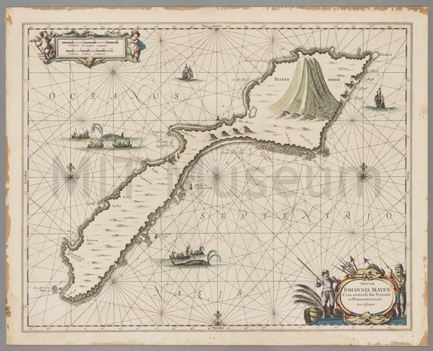 Hand-colored map of Albania. The title cartouche is surrounded by two figures, male and female, with their sheep and cattle. Three putti sit atop the title cartouche. In the upper left corner, a family of sea nypmhs hold up a cloth banner that contains the distance scale given in Mil. Germ.; Mil. Gall.; Mil. Ital.; and Stadia units. A sea monster and various sailing vessels decorate the Mediterranean Sea.