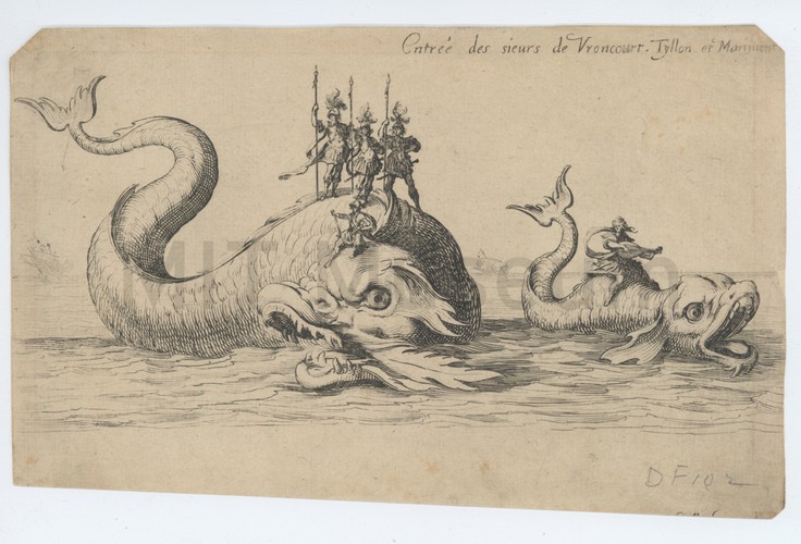 Book page illustrating an uncolored celestial map, showing both the figural representations of the constellations and the stars of which they are composed. The progress of a comet through this area of the sky is demarcated; each position has the date of observation, from 18 December 1664 to 11 February 1665. The comet passes through Cetus, the whale. Entitled "Figura observat Cometicar. Ingolstad. factar. ad eandem Communicat. Curtianam pertinens."; plate no.VI. With a paragraph of text below the image, in Latin, describing this comet.