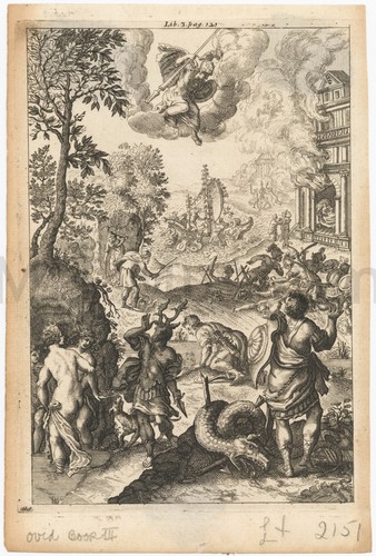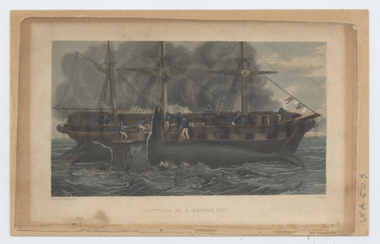 Bow view of a small fishing boat dragged up on the sand, with a net hung over one side, and two figures engaged in taking down or raising the sail. To their left, andother figure works with baskets. In the far distance, across a body of water, is a coastal city at the base of a high cliff; there is some sort of tower atop the cliff. Title and production information printed in lower margin.