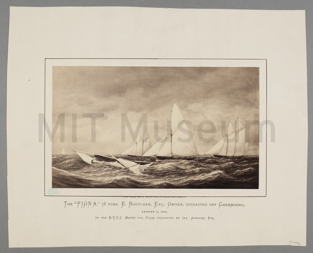 Photograph of four sailing cutters in side view. Slight motion blur to the vessels. At bottom right of the photograph is written in ink "A.H.C. 1886"--this may indicate that the photograph was taken by Clark.