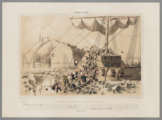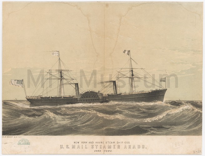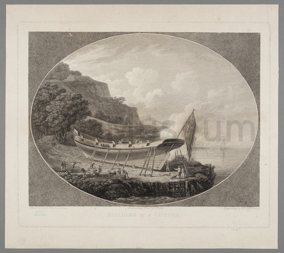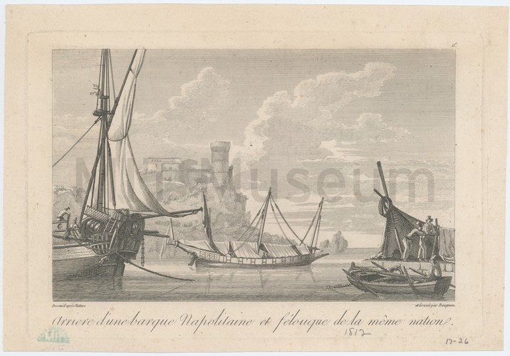 Engraving depicting a side view of a French admiralty ship, with three tiers of guns and three masts. The ship flies flags that have been hand-colored blue with gold fleur de lys and a gold coat of arms on the stern flag. Title is printed at top of the image; publisher information printed in lower margin.