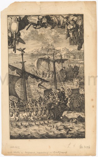 Etching depicting a side view of a frigate at sea. She flies the Dutch flag at stern. With title, "C", and "5" printed in lower margin. The letter refers to the number of the volume of Groenewegen's works, and the number to its position in that volume.