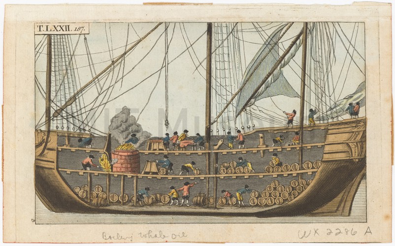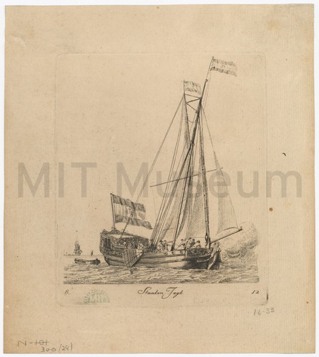 Line engraving depicting vessels of different sizes, from three-masted ships to small sailboats, at sea, with a shore and figures upon it in the foreground. Lines of washing have been erected in a tentlike structure on shore. Title and production information printed in lower margin.