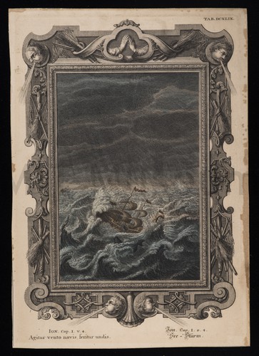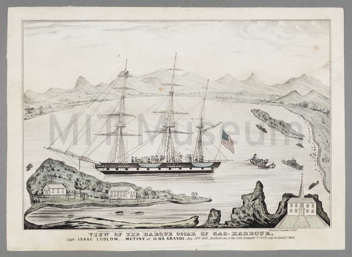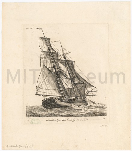 A copperplate engraving from the book titled, 'Plan de plusieurs b̢timens de mer avec leurs proportions dedi̩ �� Son Altesse Serenissime Monseigneur Louis Auguste de Bourbon' (Marseille: c. 1720) by the French Captain Henri Sbonski de Passebon. The book was a collection of naval architecture prints. This print depicts a ship portrait of a bomb ketch. A city is being attacked by a row of bomb ketches near the shore in the right background. Randon draws the arched projection path in which the shell travels from the ship to the city; pillars of smoke rise from the buildings. The rest of the background is filled up with the depictions of various war vessels such as frigates or ship of the lines and galleys.