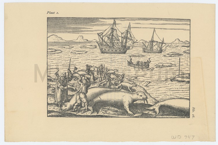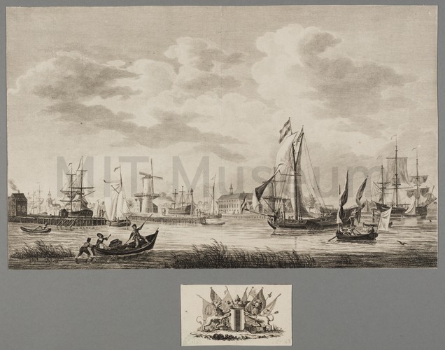 Engraving illustrating the proverb "Grandibus Exigui Sunt Pisces Piscibus esca", "Small fish are food for big fish". In the centre of the composition is a vast fish, taller than a human figure, beached and facing right. A man in a hat with an acorn-like point, and matching knee and elbow guards, makes a cut in the fish with a giant knife upon which the "globus cruciger", a cross mounted on a sphere that was a symbol of royal authority for many of the European monarchies, is carved. From the cut, and from the fish's mouth, tumble many smaller fish and mollusks; some of those fish also hold yet smaller fish in their mouths. In the foreground, two men and a child are seated in a boat with a flagon and an oar. One man, holding his knife between his teeth, pulls a small fish out of a cut-open larger fish; the child appears to be pointing at him. The other man, next to the child, points to the vast fish. Next to his hand is the word "ECCE" (Latin; translates to "Look"). In the water at left, an oyster is snapping its shell onto a man-sized fish which is itself swallowing the head of a small fish; a large fish eats a midsize fish which is eating a small fish; and on the beach a fisherman uses a minnow to catch a larger fish.