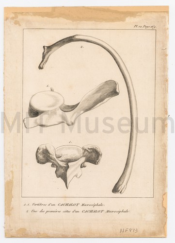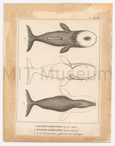 Colored engraving of a Greenland, Bowhead Whale (Balaena mysticetus) breaching. This large arctic whale (up to 100 tons) was nearly hunted out prior to the whaling moratorium and may be now be back to half its estimated former population of 50,000 It is perhaps the longest lived of all mammals and second only in mass to the blue whale.