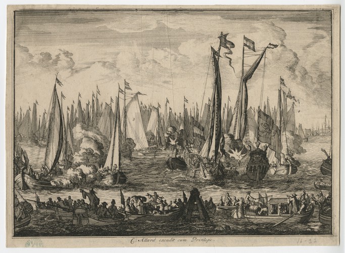 Colored engraving of eskimos hunting whales off the coast of Greenland. Two eskimos prepare to harpoon a whale as the boat approaches with another in a kayak. Another boat featured in the background has captured a whale.