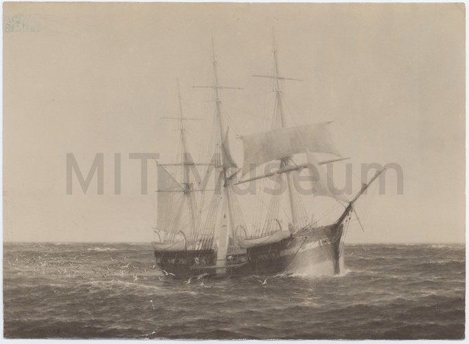 A view of the Royal Naval Hospital, Greenwich, viewed from across the southern bank of the Thames. Ships and rowing boats navigate in the river in the foreground. The halls of the hospital that flank the central courtyard recede in the distance to a single vanishing point on the horizon line. When the hospital closed in the late 19th century, the vacated buildings became the home of the National Maritime Museum.