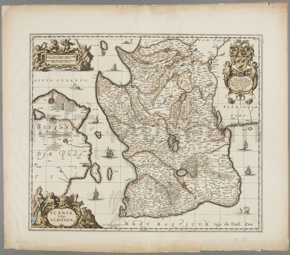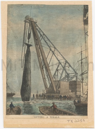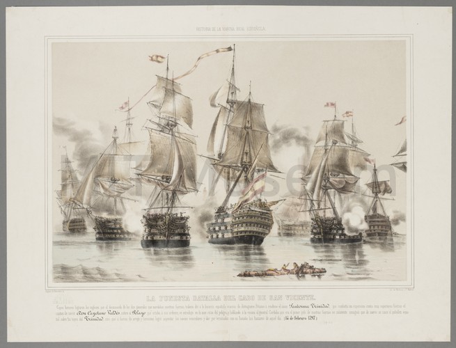 A starboard-side view of the ship of the line HMS 'Duke of Wellington' anchored in harbor. Launched in 1852, she was an auxiliary steam and sail propelled ship. She was fitted with three masts and trim, square-set yards. In the print, her sails are loose. Behind her is a fleet of vessels, and in the right foreground, a group of men in a dinghy sail towards her.