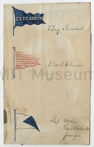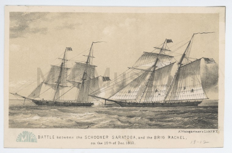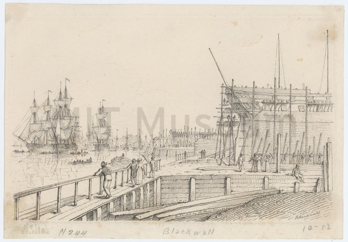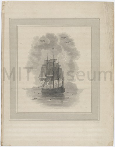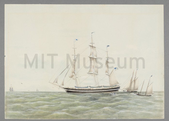 A starboard-side view of the frigate 'Vindictive' of the British Royal Navy on a port tack. The direct light onto the ship from the sun's position in the upper right accentuates the sails full and pulling. Built as a 74-gun, third rate ship of the line, the vessel was modified in 1832 as a 50-gun fourth rate frigate. The outlines of two tall ships are visible in the right background.