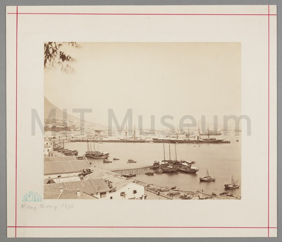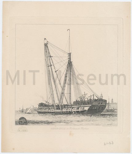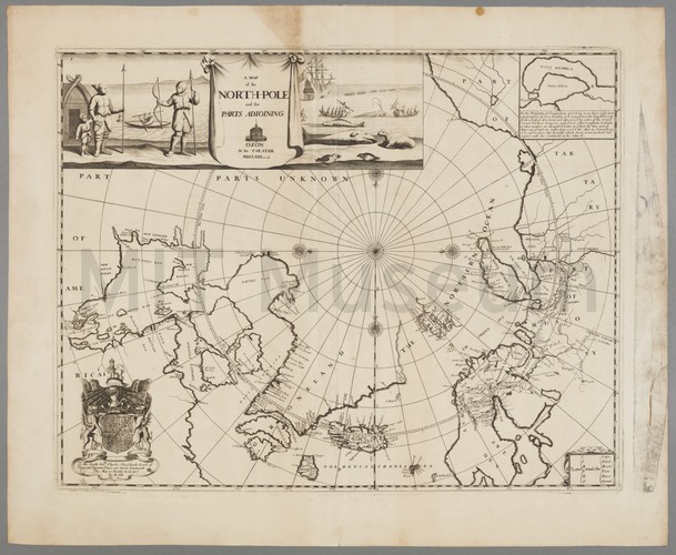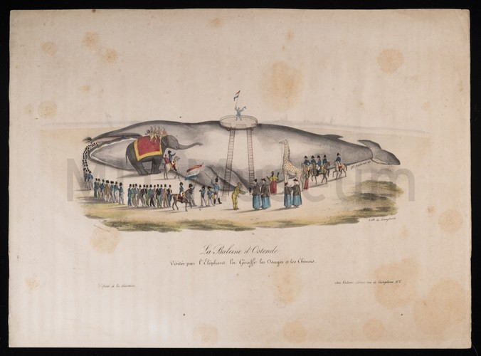 Hand-colored lithograph of men in a whaleboat approaching a whale and the harpooneersman preparing to strike. Icebergs, ships, and another whaleboat in the background. A polar bear crouches on the nearest iceberg. Title and production information in lower margin.