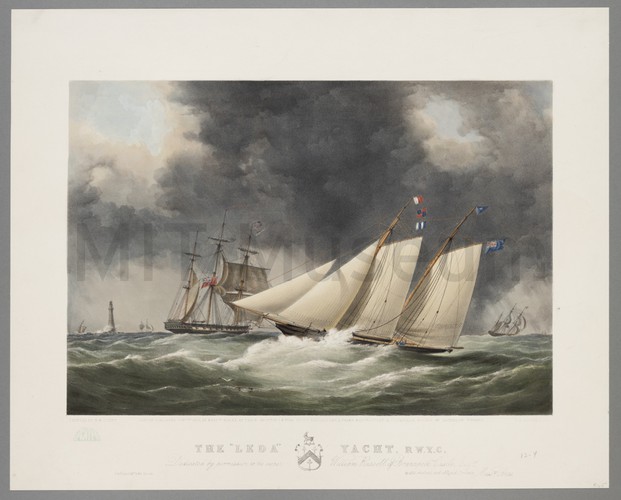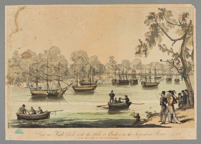 Handcolored print depicting two whaling scenes and various vignettes of whales, whale skeletons, and harpoons, with captions in English.