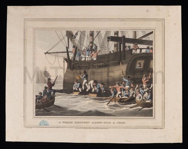 Etching depicting a three-quarters bow view of a hoeker at sea, with two small boats tethered to her, and a city on the horizon at right. As indicated in the title, she hangs her sails to dry. With title, "E", and "3"printed in lower margin. The letter refers to the number of the volume of Groenewegen's works, and the number to its position in that volume.
