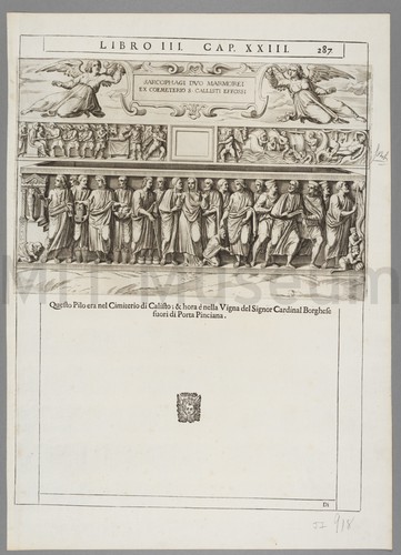 There is a cherub sitting atop a dolphin which makes up the centerpiece of the fountain. This engraving is cut from page 154 of "Biblia Das ist: Die gantze H. Schrifft Alten und Newen Testaments Deutsch D. Martin Luthers, mit dem Anhang des dritten und vierdten Buchs Esra, Wie auch dritten der Maccabeer".