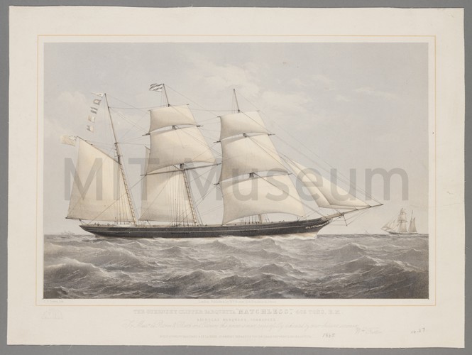 View of Jamestown as seen from the sea, with shipping in the foreground. The closest vessel, and a ship's boat to its right, both fly the American flag.