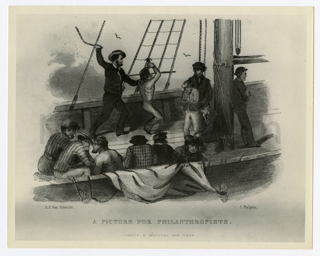 Monochrome engraving of the whale spitting Jonah, who is bearded, onto a shore scattered with shells of various shapes and sizes. There is a two-masted ship and several single-masted ships in the background and a costal city whose architecture is dominated by low domes, flat roofs, and arches; behind it are mountains. Margins are marked off by lines of red ink. Text above the engraving reads "Jonah is delivered from the fish. Jonah: 1." Text below the engraving reads "Then Jonah prayed unto the LORD his God out of the fishes [see note] belly, v: 1: etc: And the LORD spake unto the fish and it vomited out Jonah upon the dry land. vers: 10." Page is marked with page number 76 in bottom right corner.