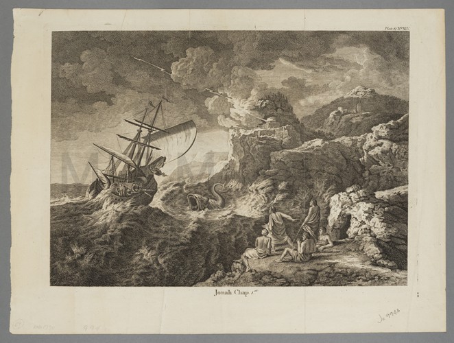 Black and white woodcut of the whale spitting Jonah up onto a seashell-strewn beach. In the background is a large ship with sails and a harbor city. On the reverse are the following passages: