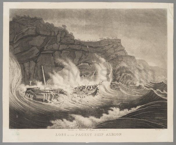 Ship portrait of a cutter, depicted in side view, at sea. There is a mountainous coast and another vessel in the background. Title and production information printed in lower margin.