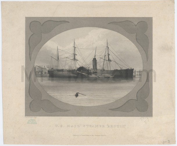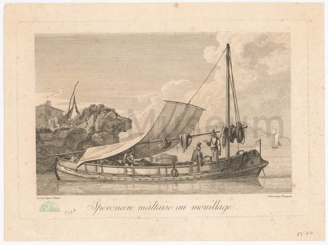 Plate 5 from a set of lithographs on the Baltic and Crimean wars, l'affaire d'orient, in 1854. Under the command of Captain Tatham, the 'Fury' successfully boarded a Russian merchant vessel and took her crew as prisoners. Two brigs-of-war, two frigates, a steam frigate immediately started to chase her. The print depicts the HMS sloop 'Fury' of 6 guns (left) towing her Russian prize (right) while being engaged in combat with the five pursuing Russian vessels. In an attempt to escape unharmed, the British sloop open-fired and eventually dropped her prize. However, she escaped with her prisoners. The title of the series is at the top in French. The title of the print is in English and French below the image