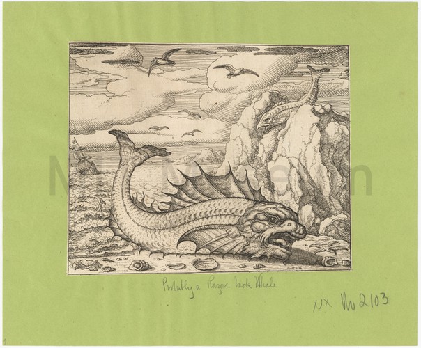 Three-fourths view of a mastless boat, with a lobster-catching basket leaning on it, and sails or nets hung out to dry over the side. The sea is visible in the background. Title and artist attibution printed at lower right side of the image.
