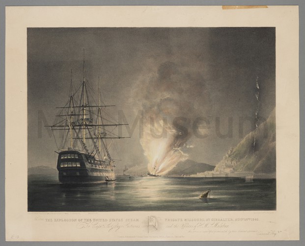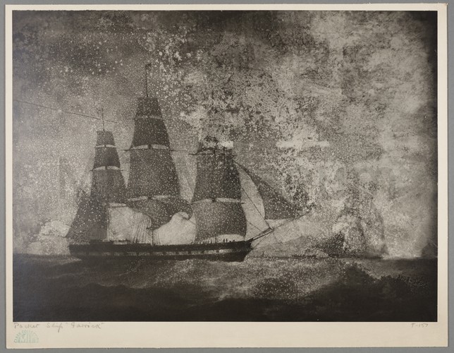 Colored engraving depicting a harpooneersman aiming at the back of a large spouting sperm whale from a whaleboat. Another whaleboat and a large ship in the background. Captioned "'Lodged his harpoon in the old fellow's side.' P. 103."