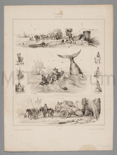 Uncolored engraved sheet with English text extolling the virtues of "Merchandize" (Merchandise?). With two whales made out of curlicue patterns, and a decorative header featuring a fanciful galley strewn with leaves atop which are a dragon and a dolphin; a sign on the galley reads " THE DRAGON, OR THE None Such Galley".
