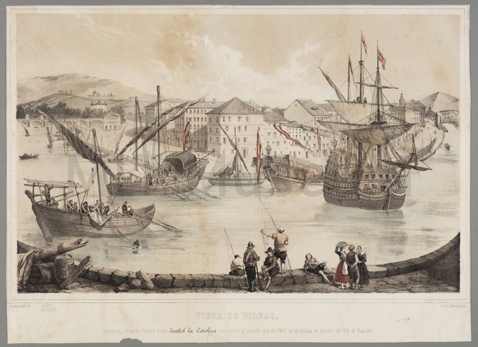 On shore, men and women in top hats gather to talk and wait to aboard/disembark rowing boats. Children play with a toy ship on the water's edge. A large fortress is in the right middleground. The cannons and guards positioned on the roof of the fortress defy logical perspectival understanding as they are depicted too small for their perceived distance. A town and other sailing vessels are in the background.