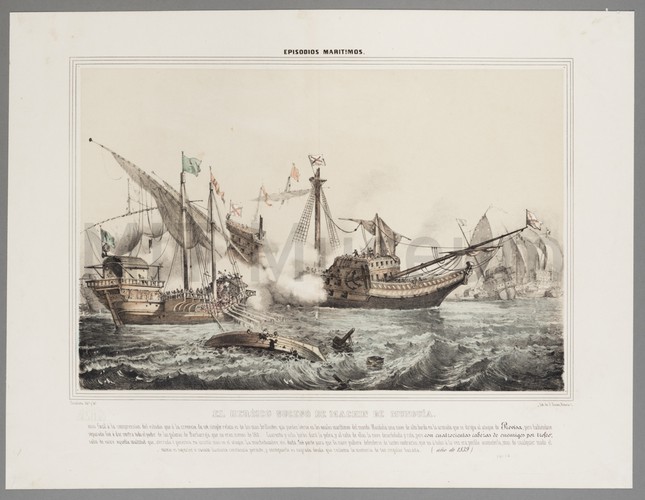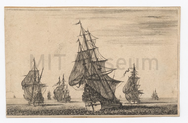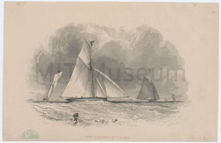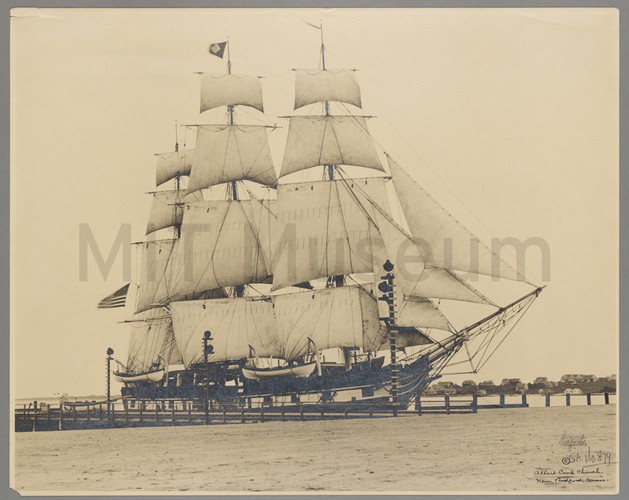 Photograph depicting a model ship in three-quarters bow view, without rigging or spars, and with a single deck of guns. There is a ruler in front of the keel to give scale; the boat has been photographed on a table, laid over with white cloths, and a white backdrop has been hung in the background. Title, maker, and date from inscription on verso.
