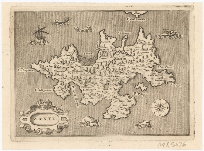Photograph of an 1817 engraving. The engraving depicts a giant sea monster, with a body like an elongated centipede and a head resembling an animal skull. In the background are ships and a view of Cape Ann. In the foreground is a small rowboat. On the engraving, below the image, is the caption, "MONSTROUS SEA SERPENT AS SEEN AT CAPE ANN".