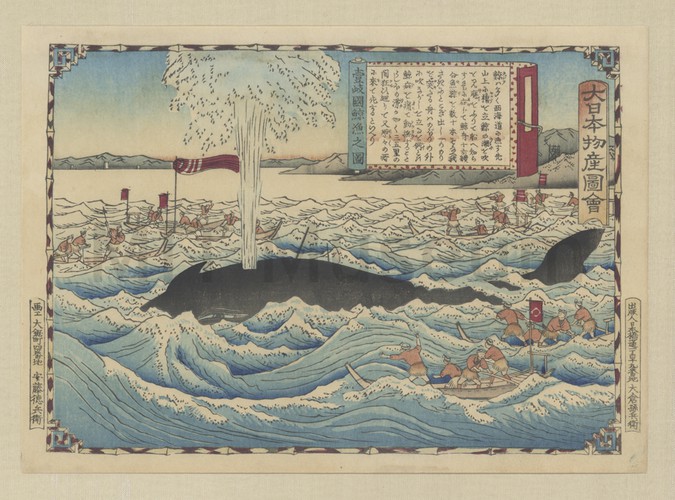 Part of an engraving depicting a painted ceiling and the statues and moulding (which includes a whale) on the ceiling. The plate appears to have been non-rectangular in shape from the impression marks. The image cuts off sharply at the left, indicating that it was cut. At top right, in the margin, is printed a small diamond or letter "O" preceeded by a dot. No other inscriptions.