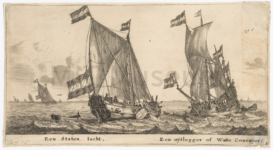 The print depicts two men standing seen from behind looking at title for series of Dutch ships inscribed on stern of warship in dock in the center. An elderly man seated on barrels of cannons smoking pipe is featured on the left with sailors, ships, crates, anchors, casks and wharves on left and right. Ships flying the Dutch flag are visible. The composition is dominated by the hull of a ship bearing the inscription (in Latin) naming the print and engraver.