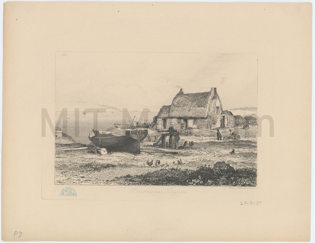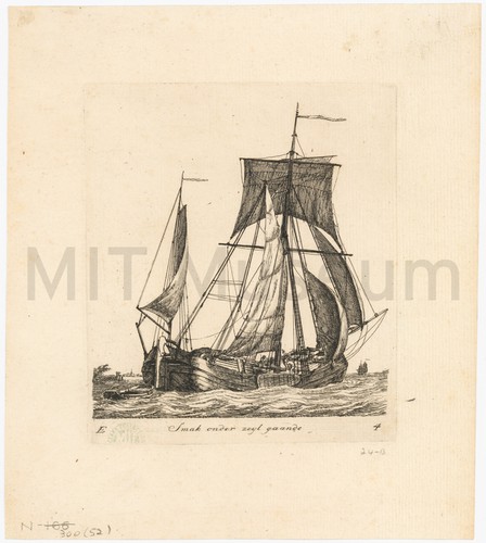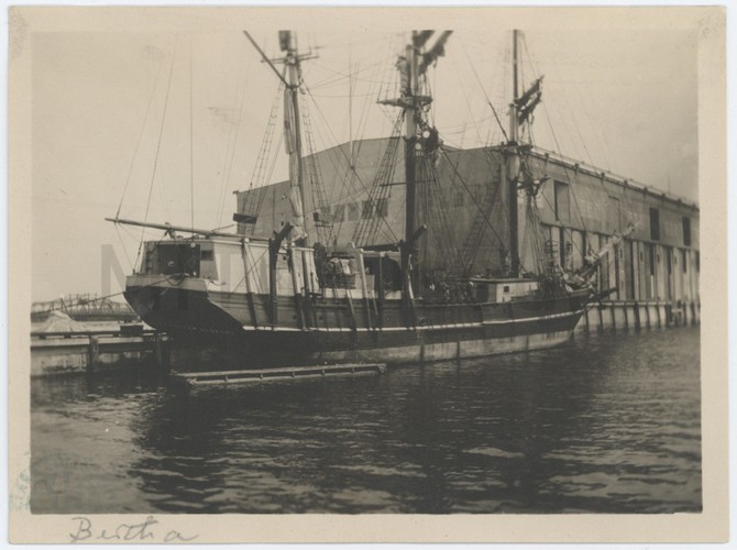 Photograph of a painting showing a steamer travelling over a choppy sea. She has three masts, and is seen in side view. Another ship is visible in the left hand background. Maker attributions in lower margin. Printed red ink border around margin. Manuscript inscription on verso identifies vessel.