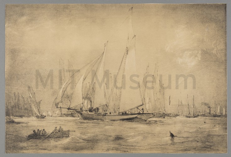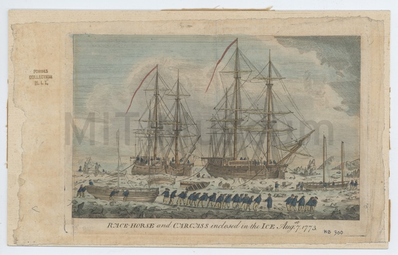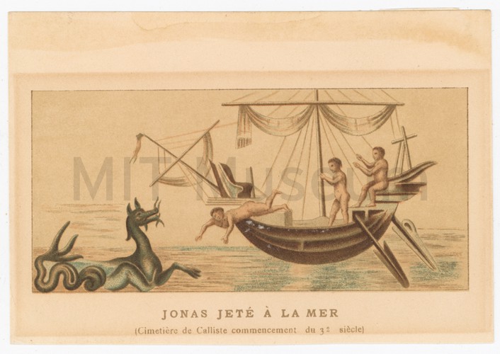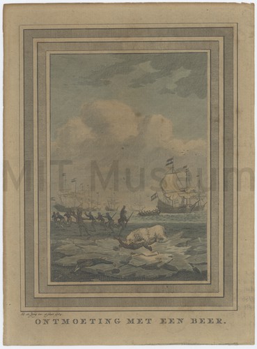 Clipping from a magazine with an article about the dangers of whaling, with accompanying illustration showing a whale flipping a whaleboat. One sailor has landed upon the whale's back, and another two are in midair; whale is spouting; icebergs in background. Source publication unknown.