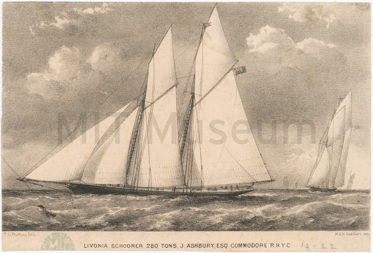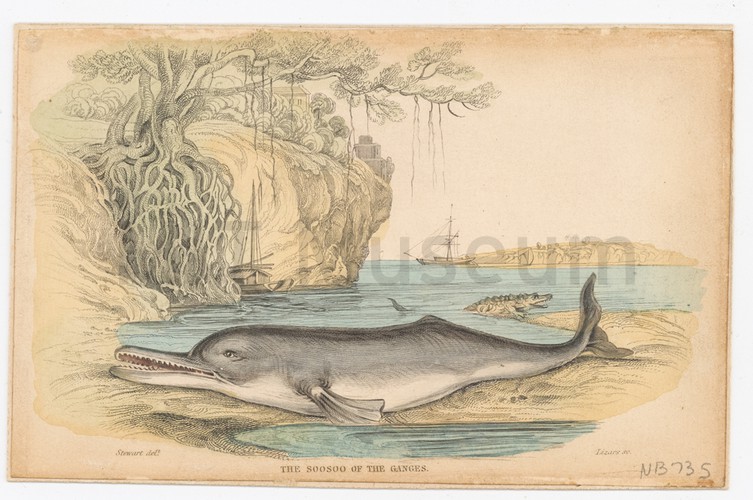 An uki-e (woodblock print employing Western conventions of perspective) depicting a whale hunt in Kumano bay, in southern Japan. The shore, with pines and houses atop it, is to the right of the composition, and from it sail a fleet of Japanese-style whaling boats with three men in each. The men throw lances or harpoons at a large whale, which is spouting, in the left hand foreground. Several harpoons are depicted in midair. Drummers in the boat and on shore encourage the whalers.