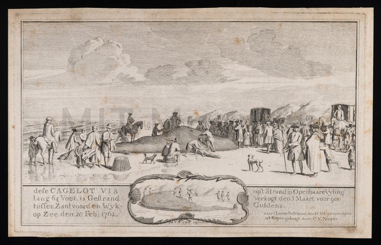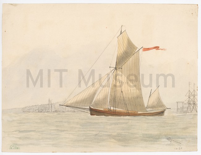 Hand-colored lithograph depicting a naval battle with two ships at left aflame, and several rowboats on the water. A coastal settlement is visible in the left-hand background. The lithographer attribution, title, and draughtsmanship attribution are all printed in the lower margin.