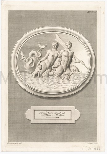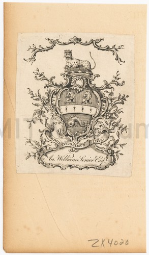 Black and white engraving of a crooked-toothed whale with its whale sticking out and spouting water. Title in Latin, French, German, and English.