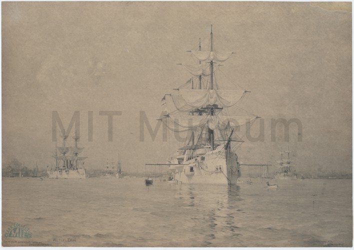 Plate 1 from 'American Yachts, Their Clubs and Races' after Frederic Schiller Cozzens. The chromolithograph depicts some of the earliest, successful American yacht racers. The yachts line up in the middle ground and a red buoy is in the right foreground. Sailors are busy at work on the decks of all the yachts. The portfolio of prints was originally accompanied by a book by U.S. Navy Lieutenant James Douglas Jerrold Kelley that described each plate and provided historical context.