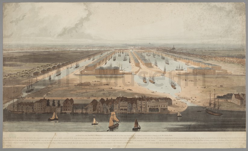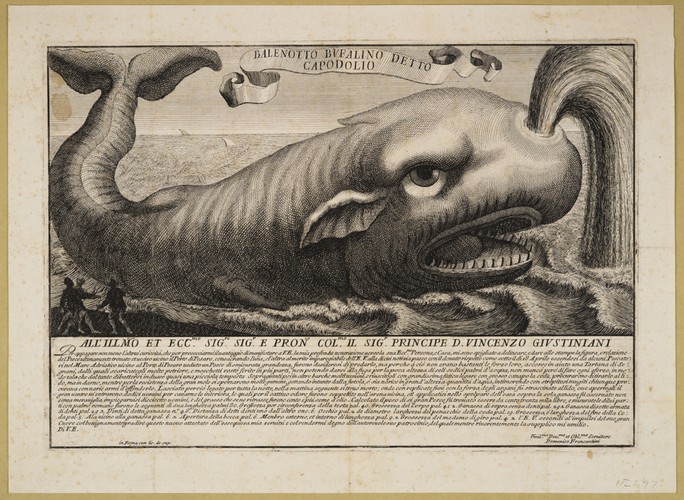 Colored engraving with two scenes of beached whales with ships and cliffs in the background. Upper scene, a common porpoise on the left, labelled "1", and a ca'ing whale on the right, labeled "2". Lower scene, a white whale to the left, labeled "3", and a narwhal to the right, labeled "4". Only the whales are colored.
