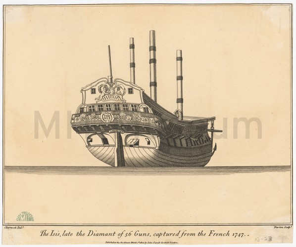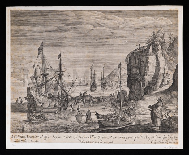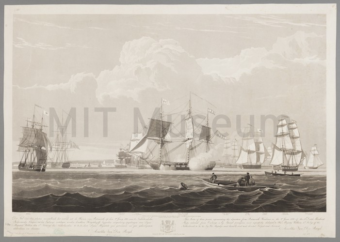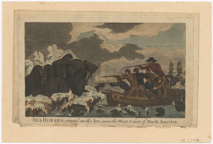 Colored print depicting two scenes of sharks, stacked vertically;the print is made of two leaves of paper carefully joined together to form a center seam. Top scene shows a shark, hooked through the mouth, being pulled up to a ship by a pair of sailors turning a winch. Other sailors look on, watching. Lower scene depicts a carpenter shark (sawfish) and a hammerhead shark in a rocky cove, with a pitching, empty ship in the background and a sailor lying prone on his back on the rocks, atop a broken spar, in the foreground.