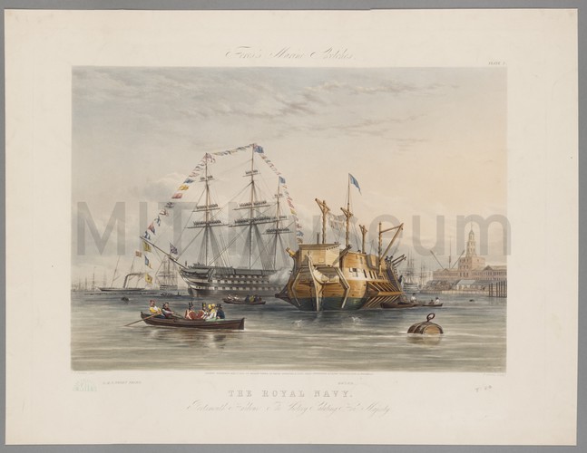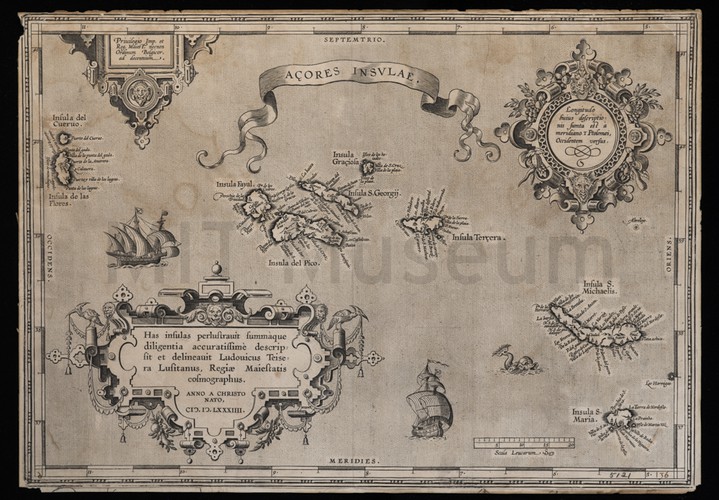 Page 693 (verso 694) from the book "De cetis" (Liber 1) by Ulyssis Aldrovandi, first edition (1613). Hand-colored. Depicts a side view of a creature similar to a carpenter shark, but with two spouts of water seemingly emerging from the far side of its head. With text in Latin. On verso, top and bottom views of the "saw" of a carpenter shark.
