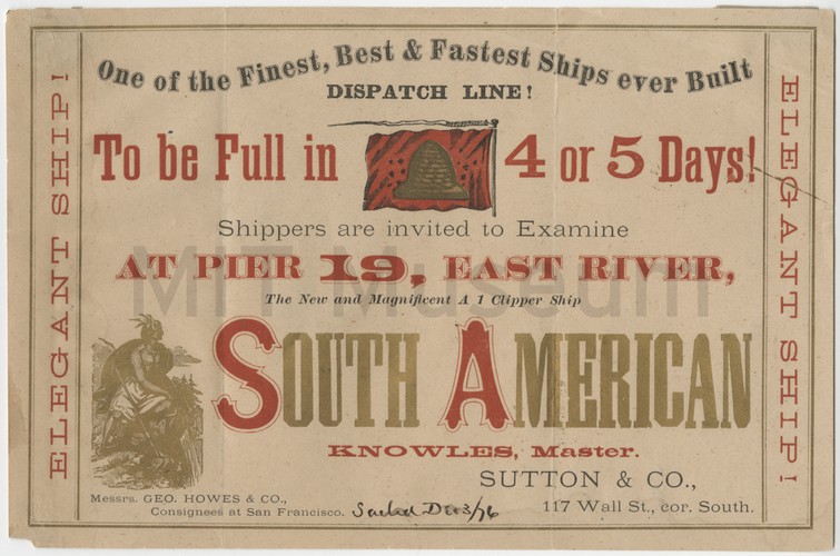 A port-side view of the steamer 'Rising Star' owned by the New-York Mail Steamship Company. The print is a proof without a title and publication information in the lower margin. Identifying information is hand written. On the cover of the paddle wheel is a large roundel with two figures flanking an escutcheon with a bird flying above it. The name of the ship and the company are also on the paddle wheel cover. The New York Times on July 23, 1865 described her as such: "The Rising Star is a picture of nautical beauty, unsurpassed by any ocean steamship, and her construction will ad lustre to the already established reputation of American skill in naval architecture."