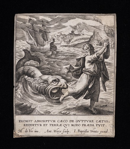 Uncolored engraving depicting Adam, at far right, naming the animals in the Garden of Eden. In the far left-hand side of the background there is a giant fish spouting, intended to represent the whale. The stars, full moon, and the light of God are visible in the sky. With an elaborate border stylized as a frame, with a skull and bones in the center bottom. In the lower margin is printed "Psal. VIII. v.4, 5. Ecquid est homo mortalis" and, in blackletter, the corresponding German translation.