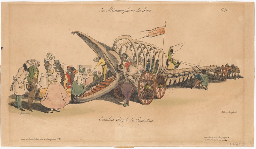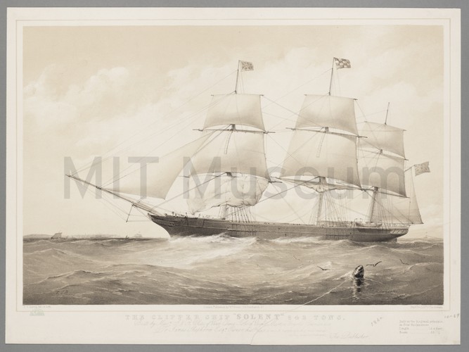 Uncolored political lithograph depicting boats on a stormy sea with passengers giving forth commentary in speech bubbles. A huge merman is visible at left, with a cornucopia of papers labeled with vices. In the foreground is a rock marked "Law-Liberty-British Constitution", on which stands a flag marked "Protestant Ascendancy".